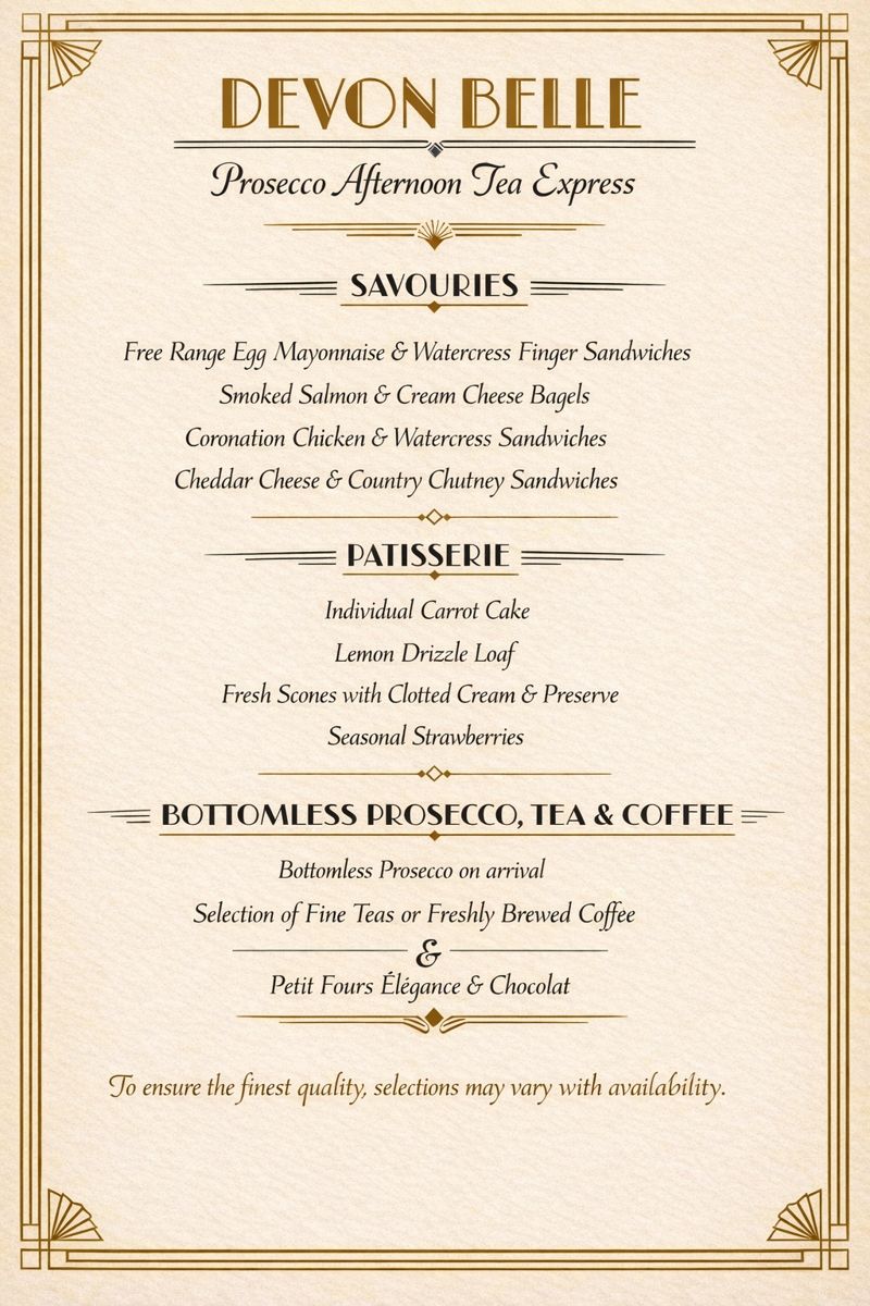 Indulge in bottomless Prosecco and an array of hand-crafted savoury and sweet delights, served aboard the rare Devon Belle Pullman Observation Car. Sit back, relax, and savour the elegance of a bygone era as you journey through the Purbeck countryside in vintage style.