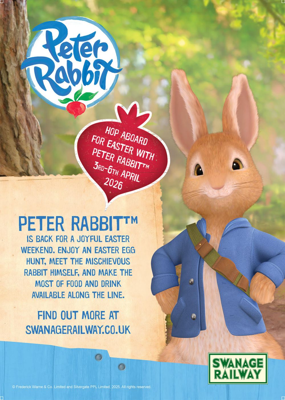 Peter Rabbit™ is back at Swanage Railway for a joyful Easter celebration the whole family will love. Join us for a charming springtime journey through the Isle of Purbeck, filled with storytelling, adventure, and a very special Easter egg hunt.
