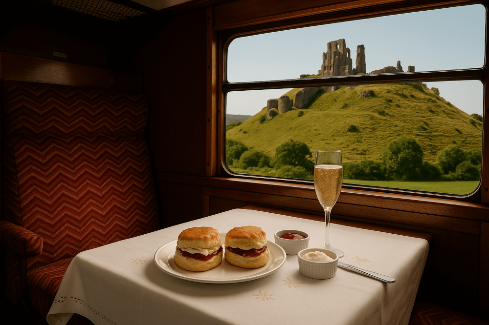 Step aboard our beautifully restored 1930s Maunsell heritage carriages, featuring comfortable upholstered seats and gleaming varnished wood panelling, for a truly indulgent experience — Scones & Sparkles through the picturesque Isle of Purbeck.