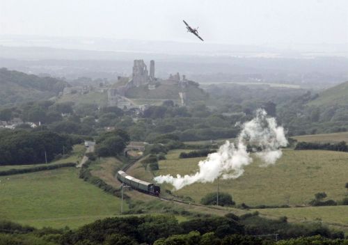 DRAMATIC FLYPASTS OVER STEAM TRAIN BY SECOND WORLD WAR HURRICANE FIGHTER FOR 'PURBECK AT WAR' WEEKEND