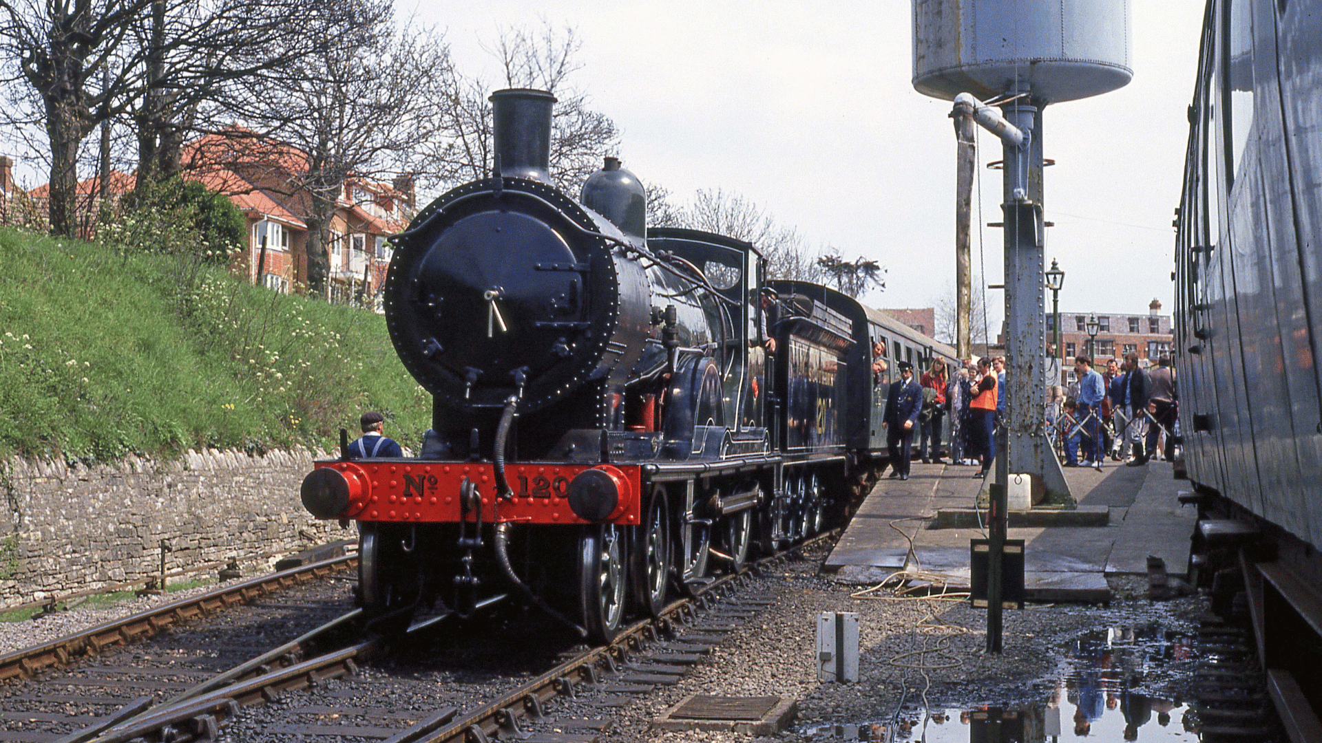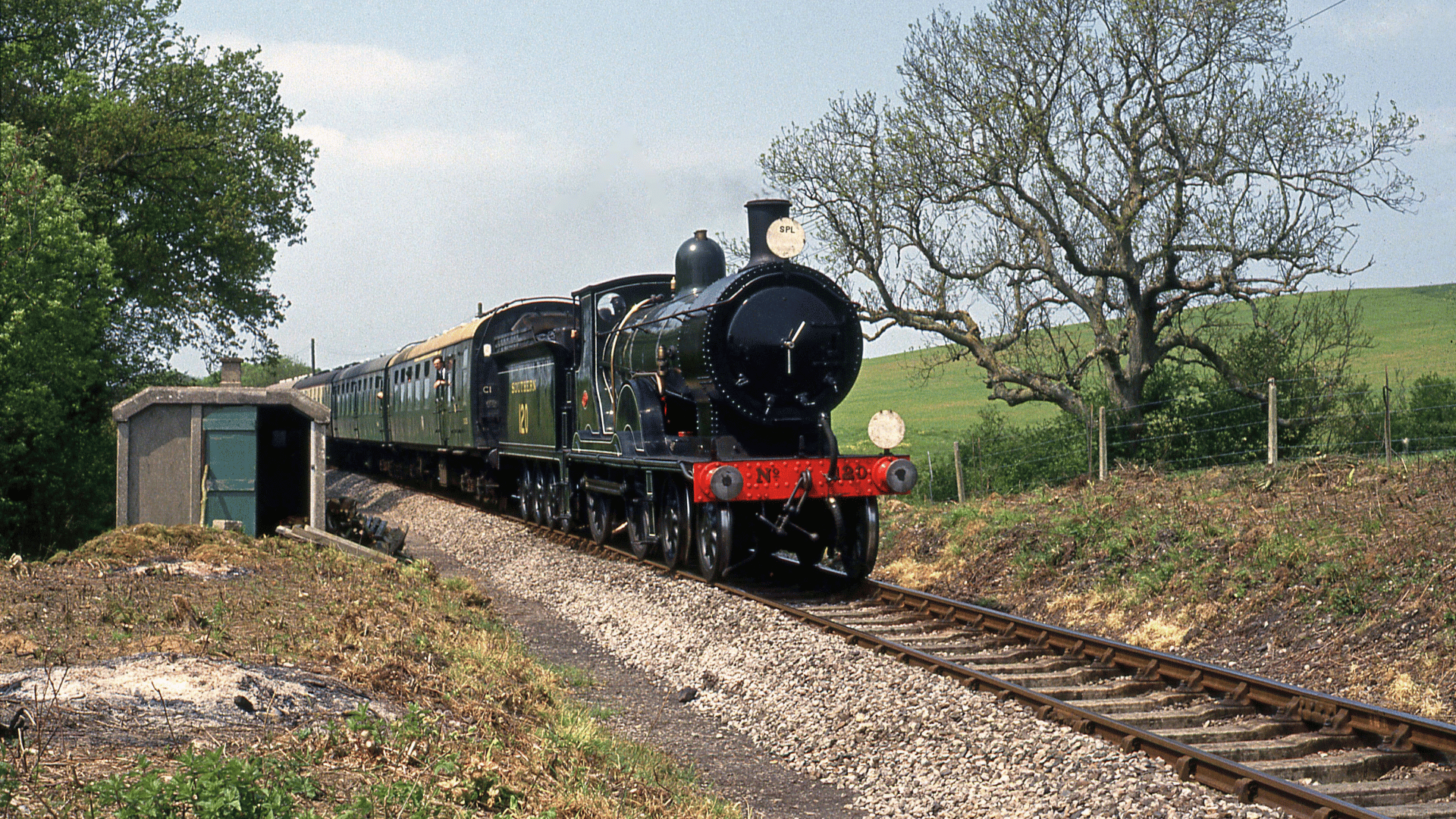 Designed by William Adams’ successor Dugald Drummond, the LSWR Class T9 gained the nickname “Greyhounds” for their quick turn of speed. No.120 was built at Nine Elms Locomotive Works in 1899. It entered Southern Railway ownership in 1923 and was rebuilt with a superheater in 1927. Renumbered 30120 following nationalisation in 1948, it was allocated to various sheds throughout its lifespan including Guildford, Dorchester and Exmouth Junction and Eastleigh.